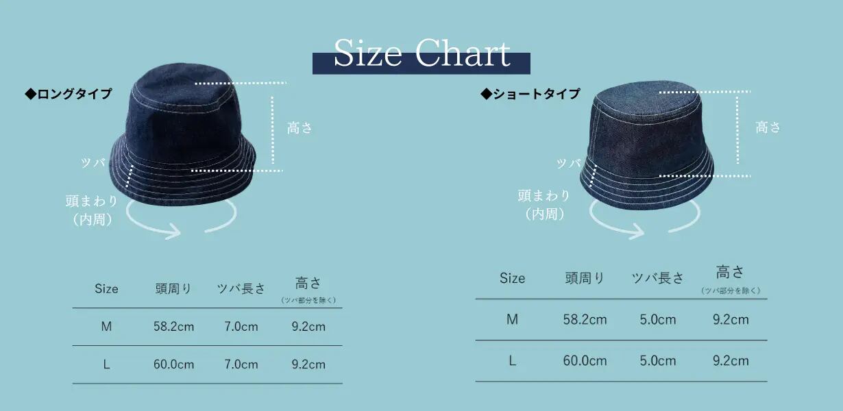 より似合うものを選んでいただきたいから、バケットハットもロングタイプとショートタイプをご用意。それぞれMサイズ、Lサイズを展開。