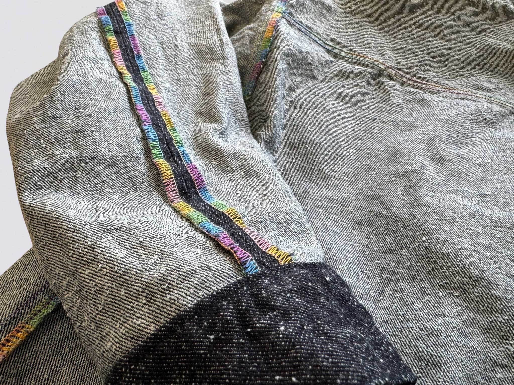 ステッチは上糸と下糸が配色仕様になっており、表地には紺糸を、裏地にはレインボー糸を使用し、表裏で異なるカラーリングを楽しめる一品。そして、表にレインボー糸が見えないのは、繊細な糸張力を活かしたこだわりの縫製技術によるもの。これにより、全体の美しさを保ちながらも、細部にまで職人の技が光ります。